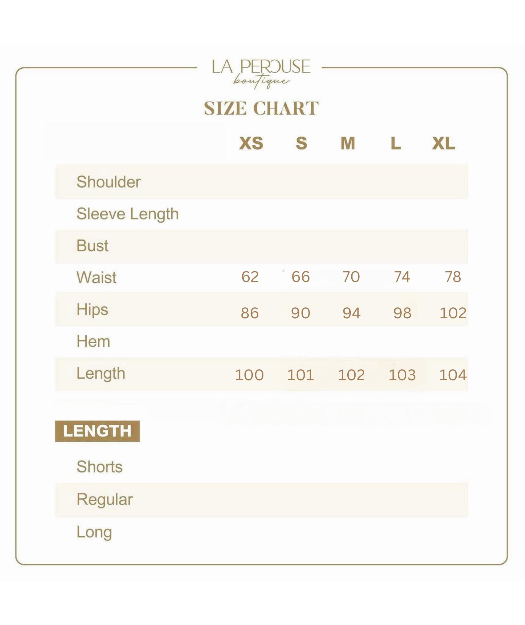 • The model wears size S/ M and is 161cm tall, 25.5” (64.8cm) high waist, and 35.5” (91cm) hip.