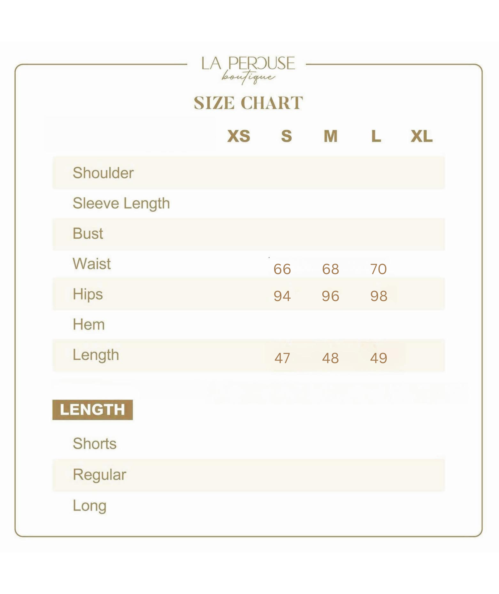 • The model wears size S and is 161cm tall, 25.5” (64.8cm) high waist, and 35.5” (91cm) hip.